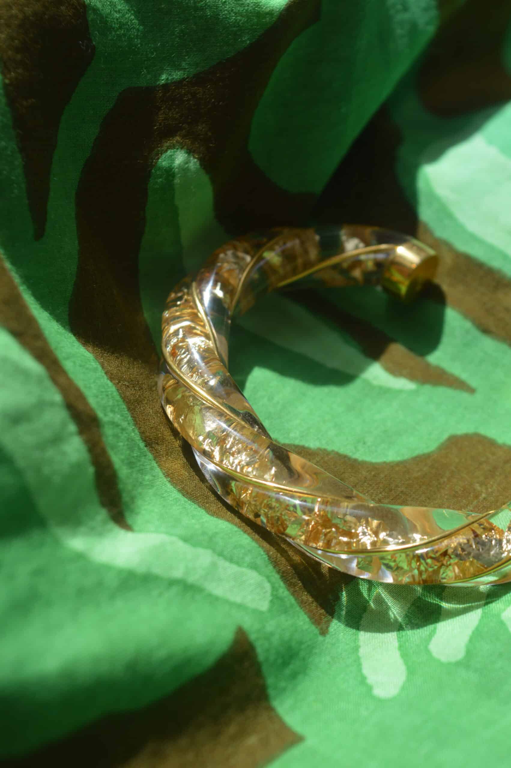 Emblématique de la maison Aurélie Bidermann, le jonc Diana est un bracelet torsadé ici confectionné en bakélite transparente et feuilles dorées.