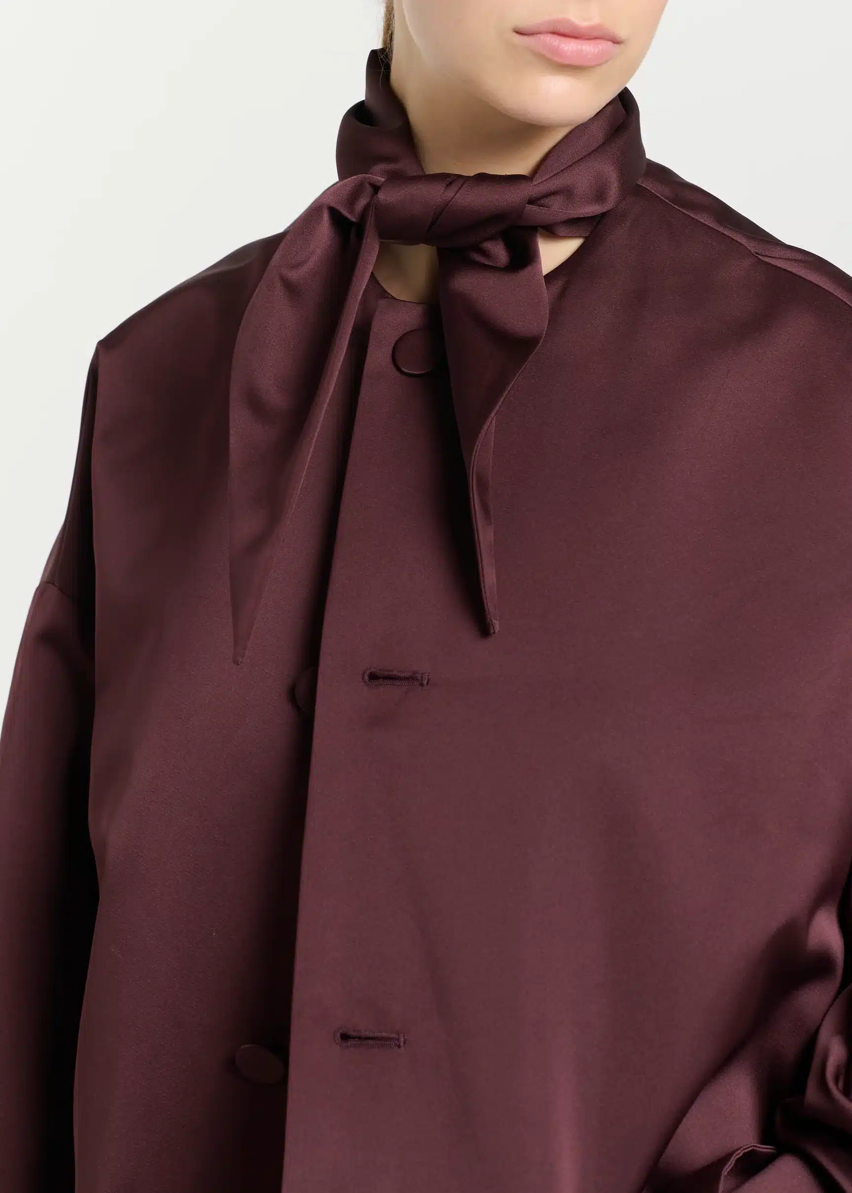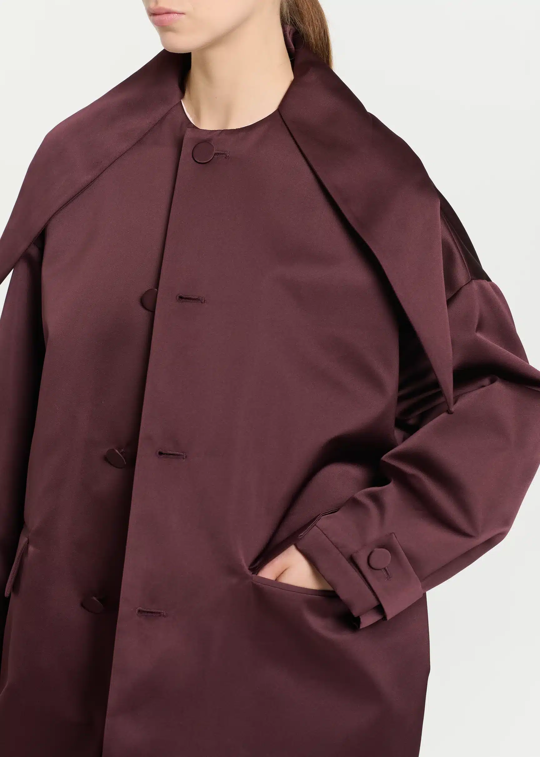 Issu de la collection automne/hiver de la maison italienne Plan C, ce manteau long est confectionné en duchesse, un tissu très riche avec une main dense et un aspect brillant. Il présente un col châle amovible, des manches longues et ceinturées aux poignets.