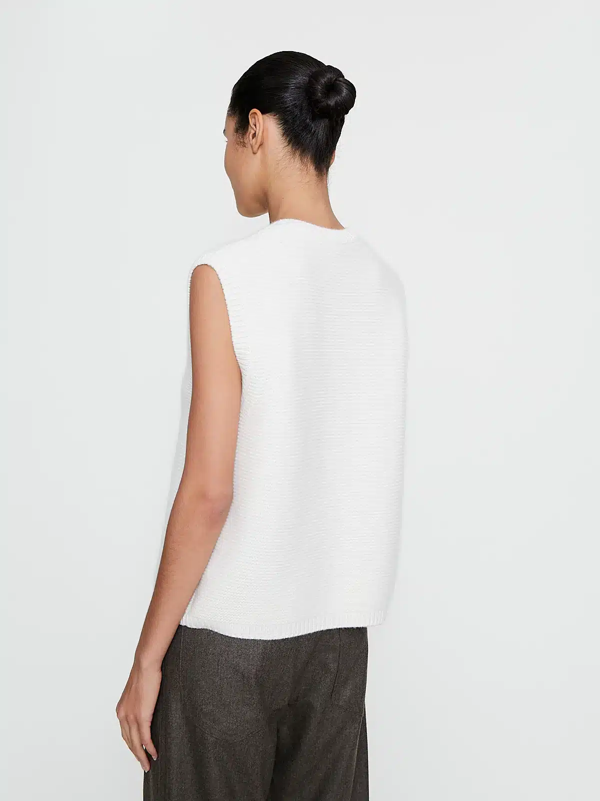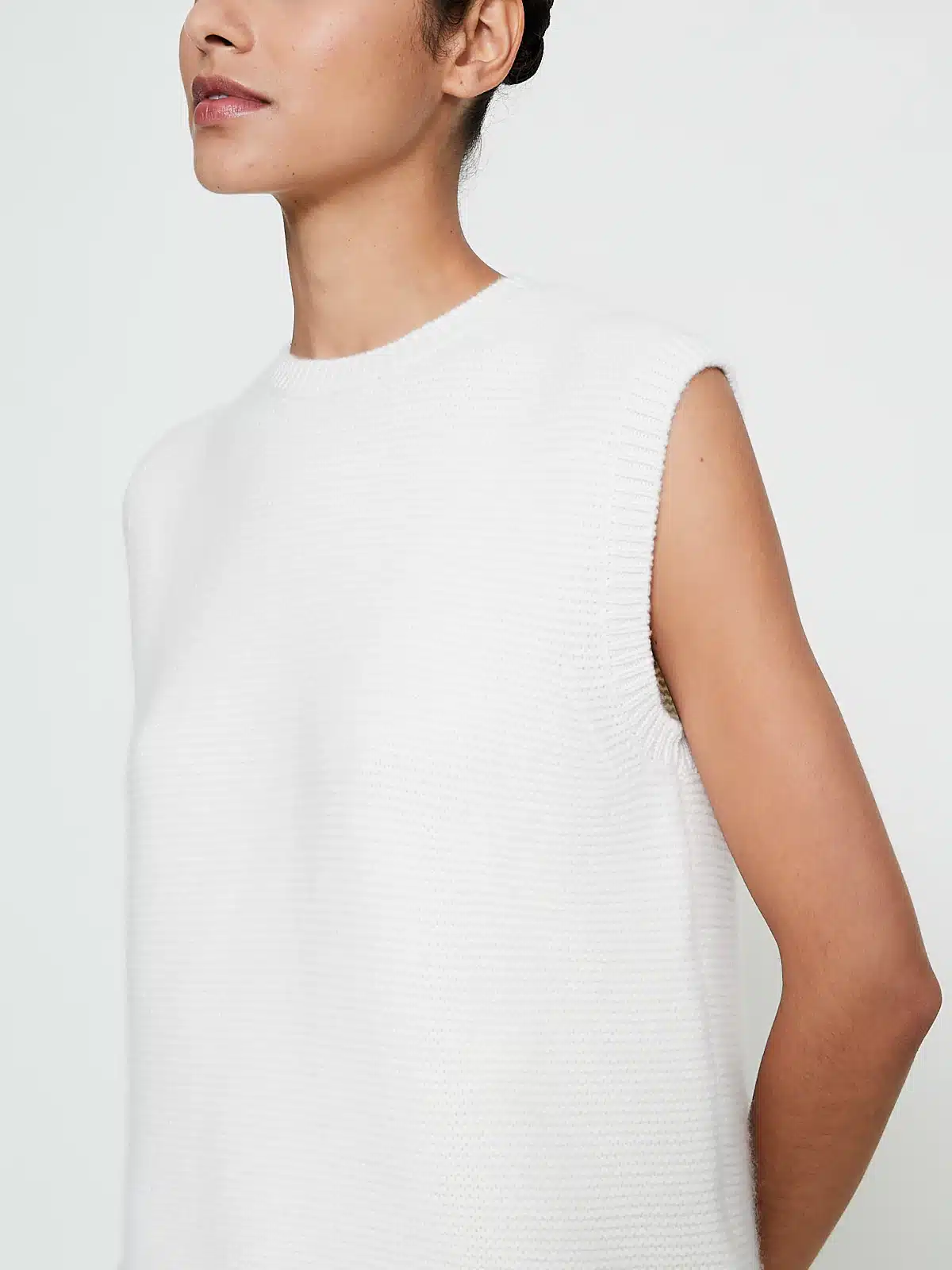 Issu de la collection automne/hiver de chez Sofie D’Hoore, Matta est un pull sans manches confectionnée dans une maille en cachemire très douce. Il présente une finition bord côtes autour du cou.