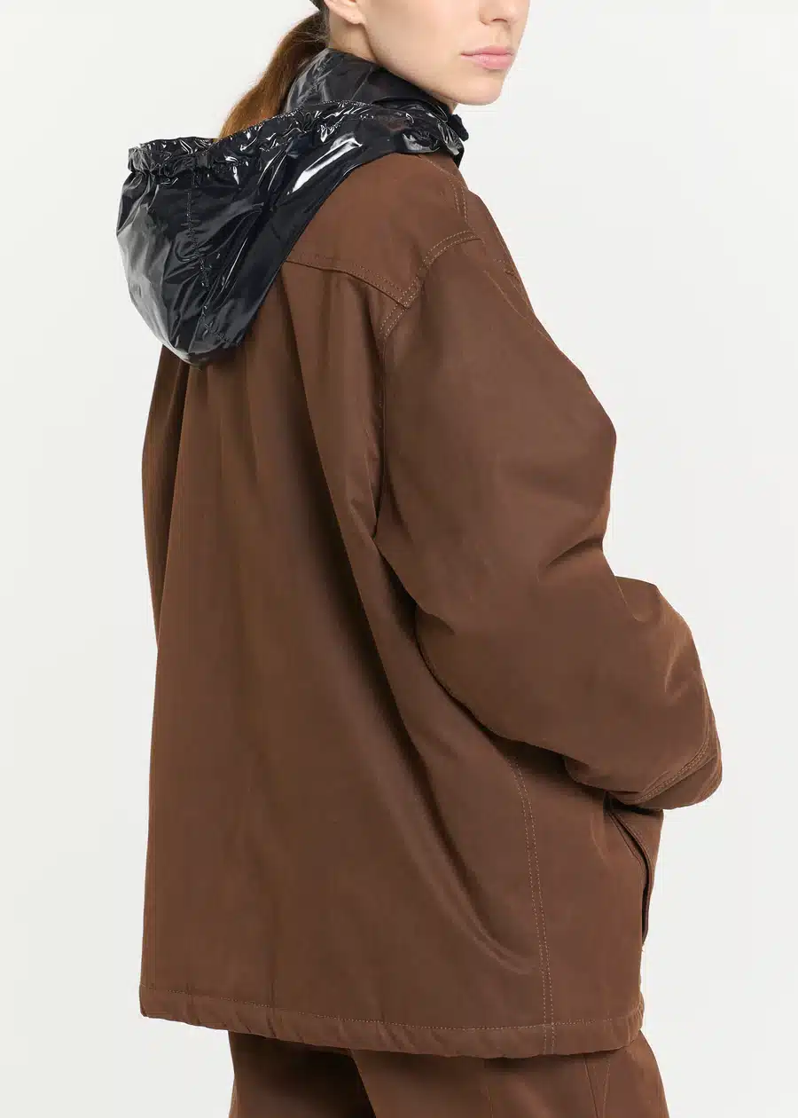 Issue de la collection automne/hiver de la maison Plan C, cette veste cargo est confectionnée dans un twill de coton lavé. Elle présente 4 poches plaquées et une capuche noir brillante amovible.